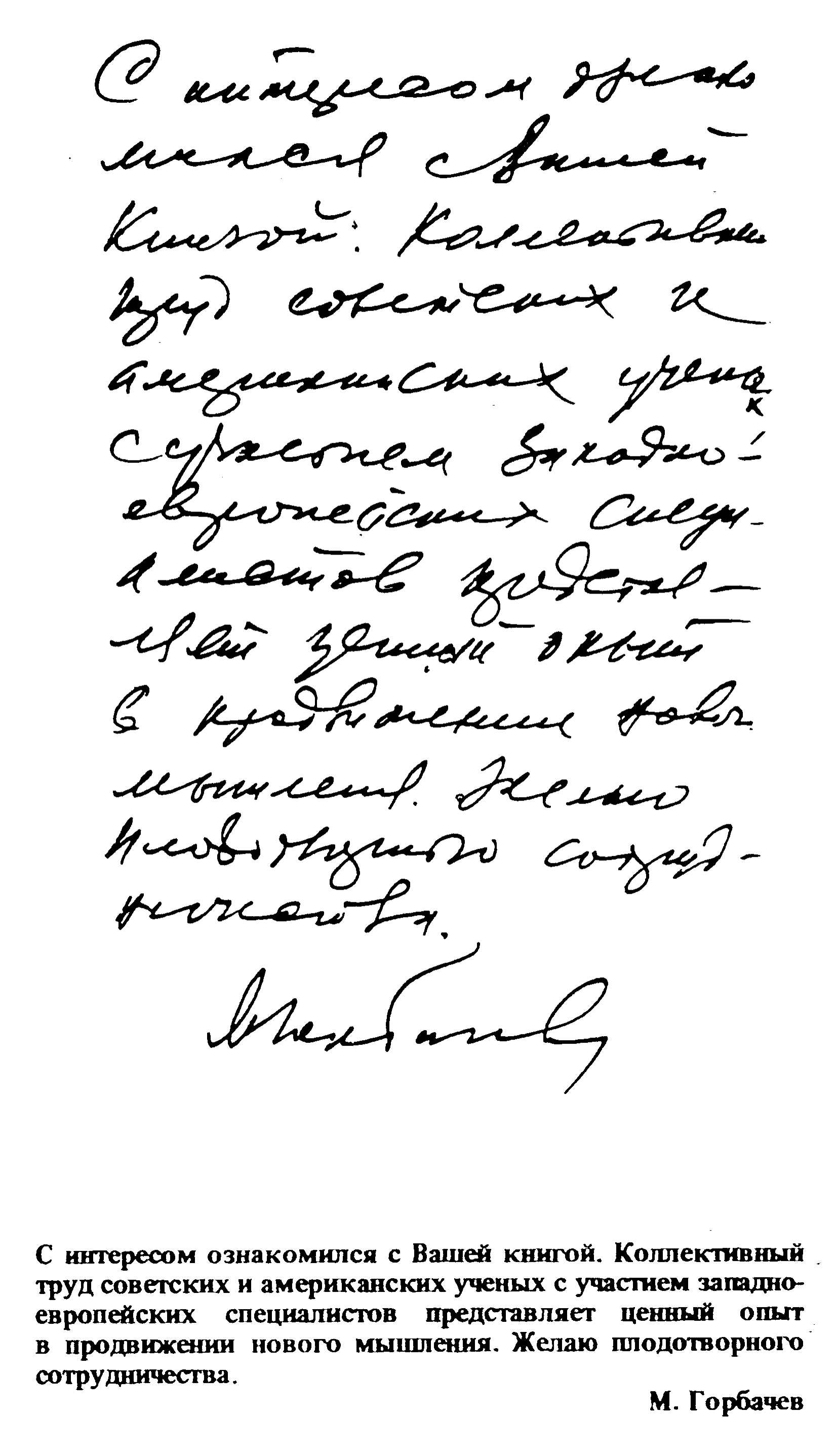 "I have examined your book with interest. This collective work of Soviet and American scientists, with participation of Western European experts, represents a valuable experience in the promotion of new thinking. I wish you a fruitful cooperation." M. Gorbachev.