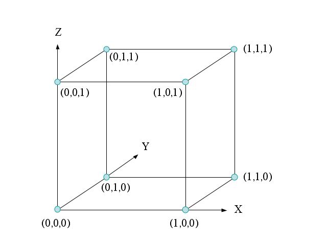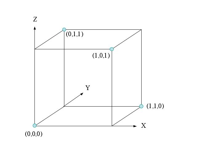 If we just send each bit on a single pulse then, even though there are 3,000 dimensions (pulse-frequency combinations) per second, the high dimensional nature of the space need not be considered since there is no interaction among the different dimensions. Since I cannot draw a 3,000 dimensional picture, let's consider just three dimensions, corresponding to the three pulses that can be sent in the first millisecond, one each at 1 kHz, 2kHz, and 3 kHz. Since each of the three pulses can have amplitude zero or one, there are 2x2x2 = 8 possible signal combinations. We can represent these eight possible signal combinations (called a signal constellation) in three dimensions as shown below.