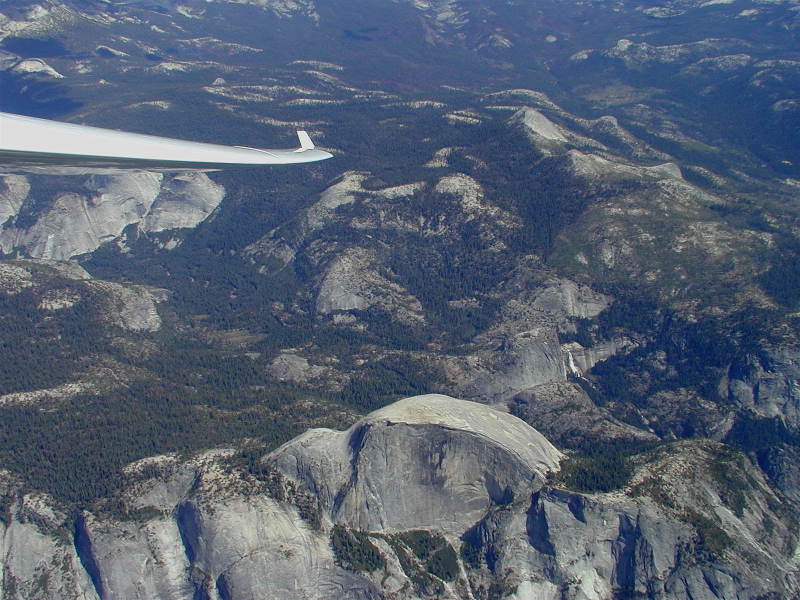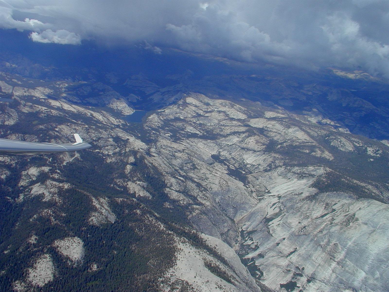 Before leaving Tenaya Lake I enjoyed a view of May Lake, a few miles to the northwest. A gorgeous, almost circular alpine lake, at 9,300 feet it sits nestled over a thousand feet above Tenaya Lake, with Mt. Hoffman towering over both at almost 11,000 feet. I had hiked into May Lake several times and climbed Mt. Hoffman once. The contrast between the labored pace of a hiker, where averaging 1 mph with rests is not uncommon, and the glider's slipping effortlessly through the air at 100 mph was striking.