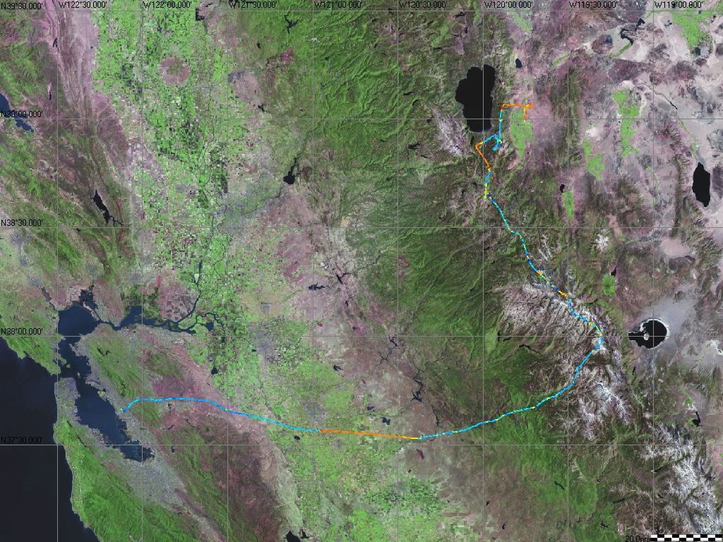 The map below shows the entire route of flight from Minden, NV to Hayward, CA, superimposed on satellite views of the Earth. Minden is just east of Lake Tahoe, near the top of the map. Hayward is on the east side of San Francisco Bay, near the lower left corner. Mono Lake and Yosemite are near the lower right corner, with Paoha Island clearly visible in the middle of Mono Lake even in this 200 nm (230 statute miles) wide map.