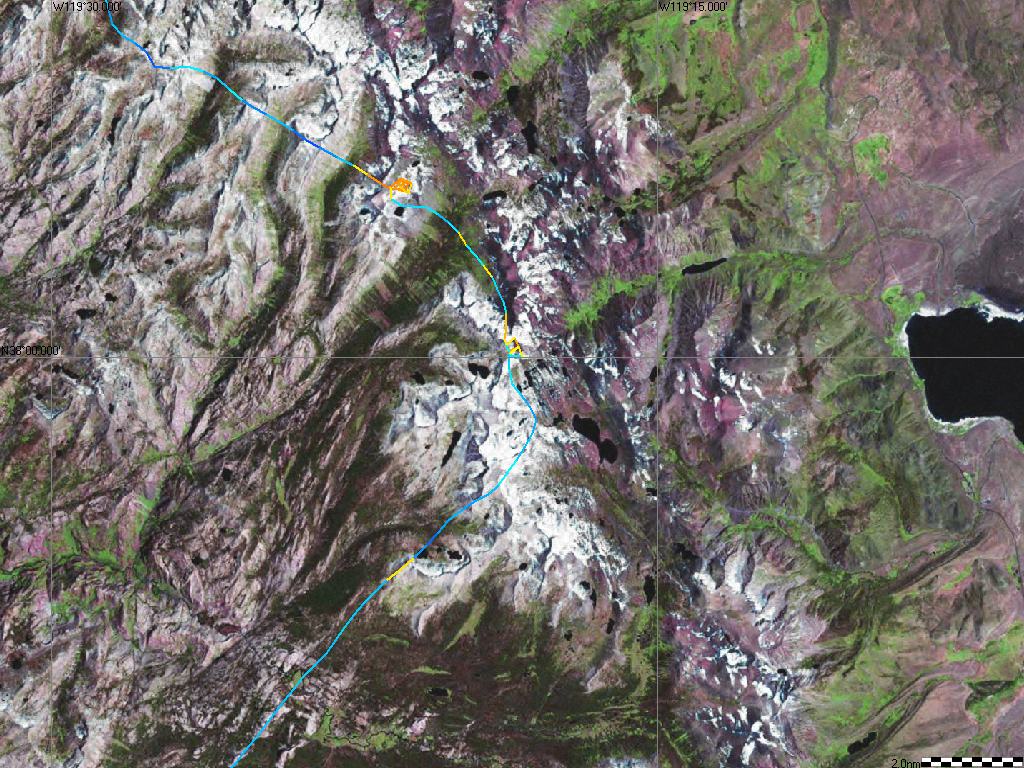 The photo below was taken looking SW from the Picture-Thermal. The center of the photo shows Upper McCabe Lake, shaped like Saddlebag Lake but smaller. Two even smaller McCabe Lakes are above and to its right. (The one in the upper right corner of the photo is only partially visible and hard to see.) North Peak (12,250’) is in the upper left corner of photo. The tip of Roosevelt Lake is at the top center of photo. (If interested in finding these places on the maps: Upper McCabe Lake is barely discernable in the 50 nm map just to the left and slightly below the Picture-Thermal, but is easily seen in the 20 nm map which follows this photo. Roosevelt Lake, the long, thin lake just above the d's of Saddlebag in the 50 nm map, is also much more visible in the 20 nm map, where it is about as far to the left of my flight trace as Saddlebag Lake is to its right, and at the same height in the photo.)