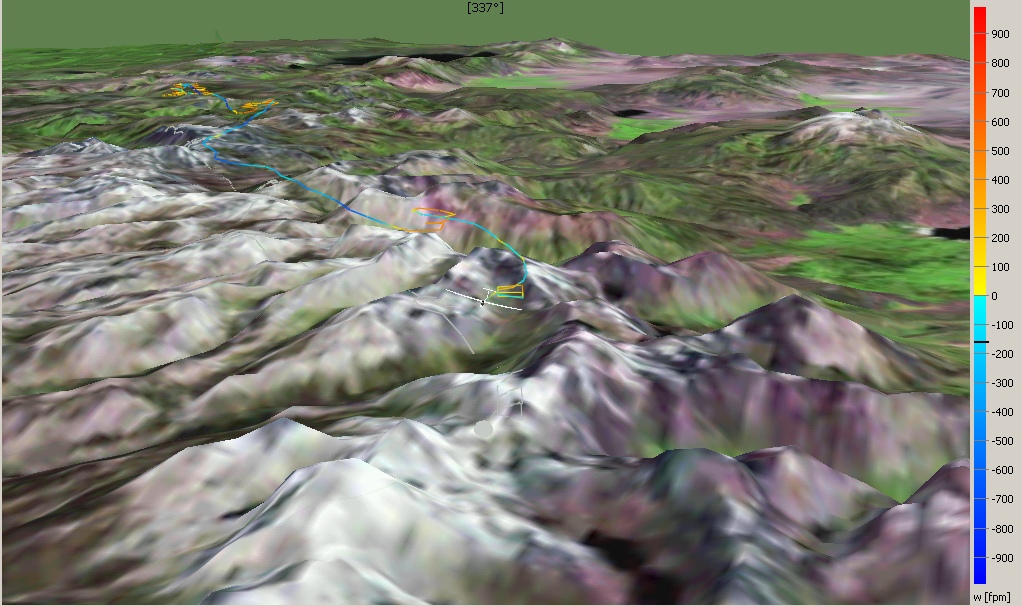 Climbs in several thermals can be seen. The Picture-Thermal provided almost no altitude gain and was either very weak or I was not well centered due to the distraction of taking pictures. The difference in thermal strength can also be seen in the 2D maps. The Picture-Taking thermal is yellow and the preceding, stronger thermal (with an obvious altitude gain seen above) is a hotter orange color. The 3D picture has a scale on the right hand side showing the color key for climb and sink rates in feet/min. In addition to the color coded trace showing the glider's position through the air, SeeYou shows a gray trace for the glider's position over the ground.