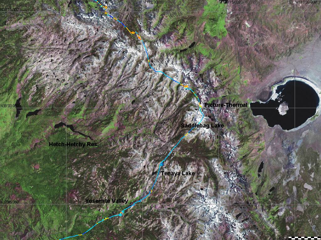 The first four photos below were taken while circling at 15,000 feet in the thermal indicated by the yellow blip closest to Mono Lake. This thermal was located about 10 miles north of Tioga Pass (the east entrance to Yosemite National Park) and is marked along with several other landmarks in the map below which has a 50 nm width. (The Picture-Thermal is the yellow blip just to the left of the P of its label. Saddlebag Lake is just above the L of its label. Tenaya Lake is just to the left of its label and my flight trace. Yosemite Valley is the green area just below its label. Tuolumne Meadows is the horizontal green area above the Tenaya Lake label, and Lyell Canyon is the almost vertical green area to the right of the Tenaya Lake label. Most of these landmarks will figure in later photos.) The satellite images were taken earlier in the year so they show more snow than is present in my photos.