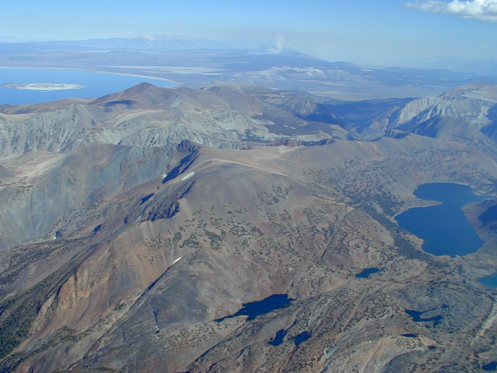 The photo below was taken looking southeast from the Picture-Thermal. Saddlebag Lake is at right center, shaped like two saddlebags, and Mono Lake is the large lake at the top left with Paoha Island in its center. Tioga Peak is the rounded mountain just beyond Saddlebag Lake at the right edge of the picture. Mt. Dana, at 13,053 feet the second tallest peak in the park, is behind Tioga Peak, with Tioga Pass running between them. Of interest mostly to those who have hiked the area: Z Lake (obvious by its backwards Z shape) is near the bottom right corner; Hummingbird Lake is slightly to the left of a line connecting Z and Saddlebag Lakes; Twin Lakes (not the same as the ones near Bridgeport - these are much smaller) are at the bottom center; and Odell Lake (the longer one) is just above Twin Lakes.