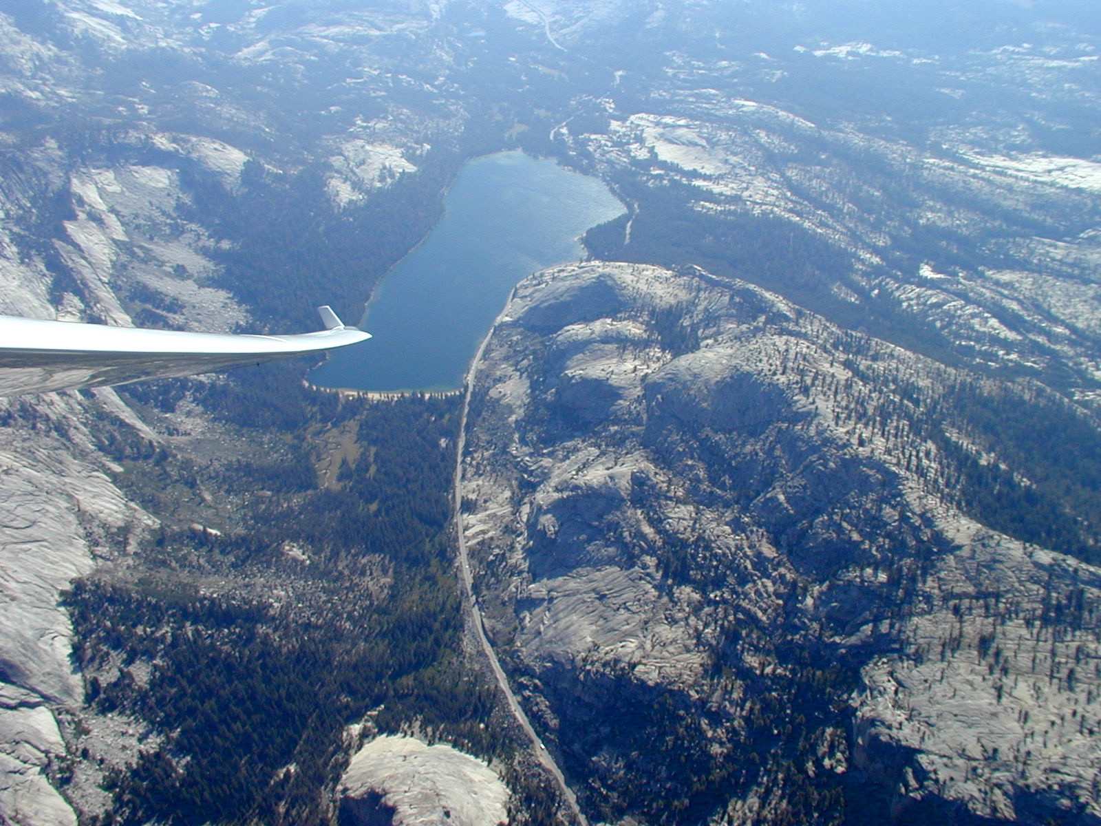 This day was even better than usual for soaring the Sierras since I was able to cross at Yosemite without using my engine. Crossing as a glider near Tahoe is much easier since the Sierras there are lower and narrower with passes around 7,300 feet, most peaks under 10,000, and at most a few miles to traverse before you have a clear shot at a safety airport to the west. But here at Yosemite, Tioga Pass is 10,000 feet, many peaks exceed 12,000, and the "high country" is 20 miles wide. Another impediment to a glider crossing at Yosemite is the prevailing westerly winds. These usually produce strong sink on the east (lee) side of the Sierras. But some days, the winds are light, the thermals are high, I can comfortably execute a glider crossing at Yosemite, and I feel truly blessed. I hope some of that feeling can be communicated on this page.