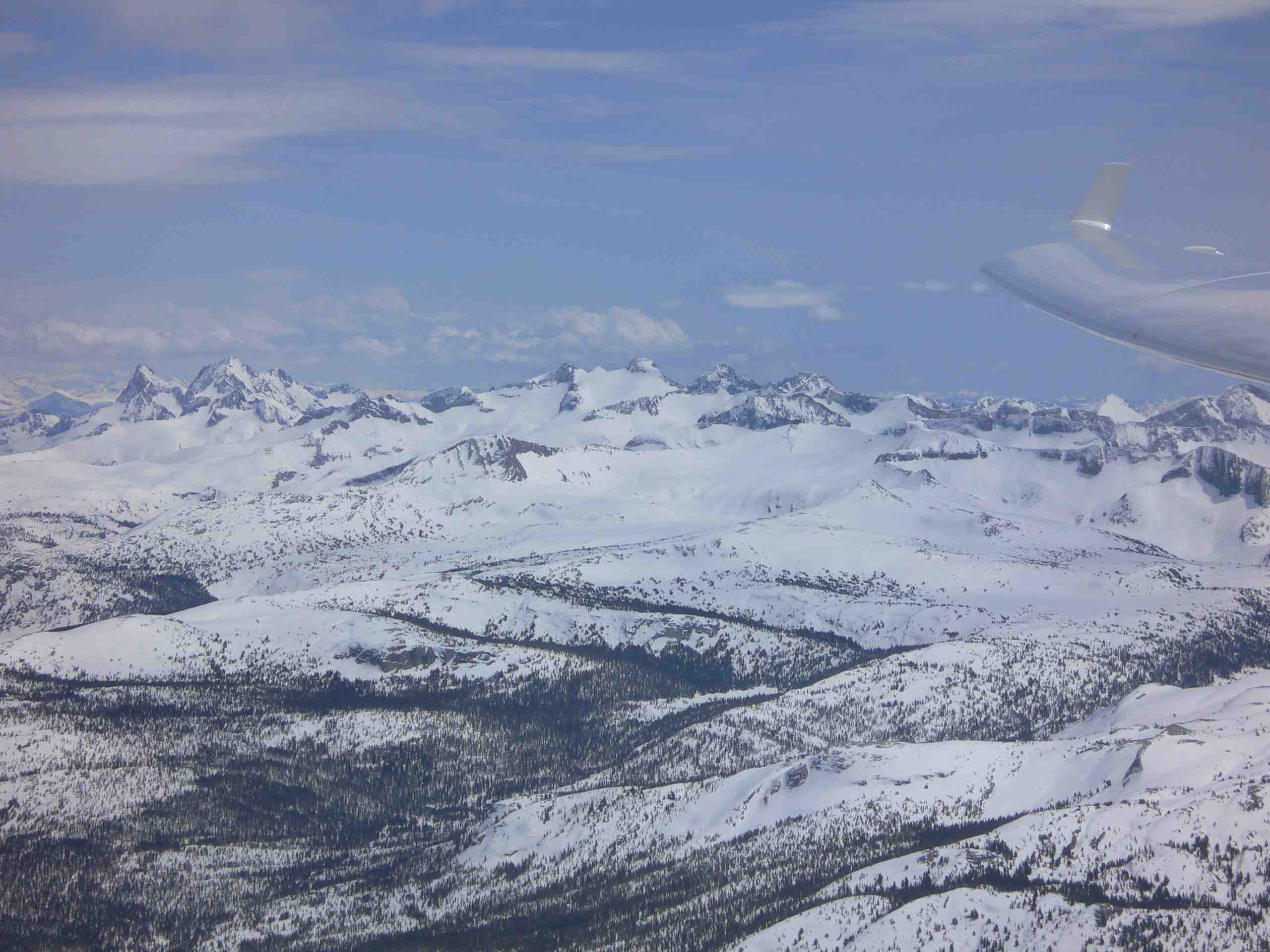 Twin Lakes, in the Hoover Wilderness Area just north of Yosemite on the East side of the Sierras and about 10 miles southwest of Bridgeport, California. This photo was taken on April 7, 2002, on a different flight from the other five pictures. It is included here since the time of year and snowpack are approximately the same. There are many "Twin Lakes" in the world and, even in this area, there is a much smaller Twin Lakes near here, which can be seen in the September 12, 2003 photo sequence, accessible form the "Return to Soaring Photo Links Page" below.