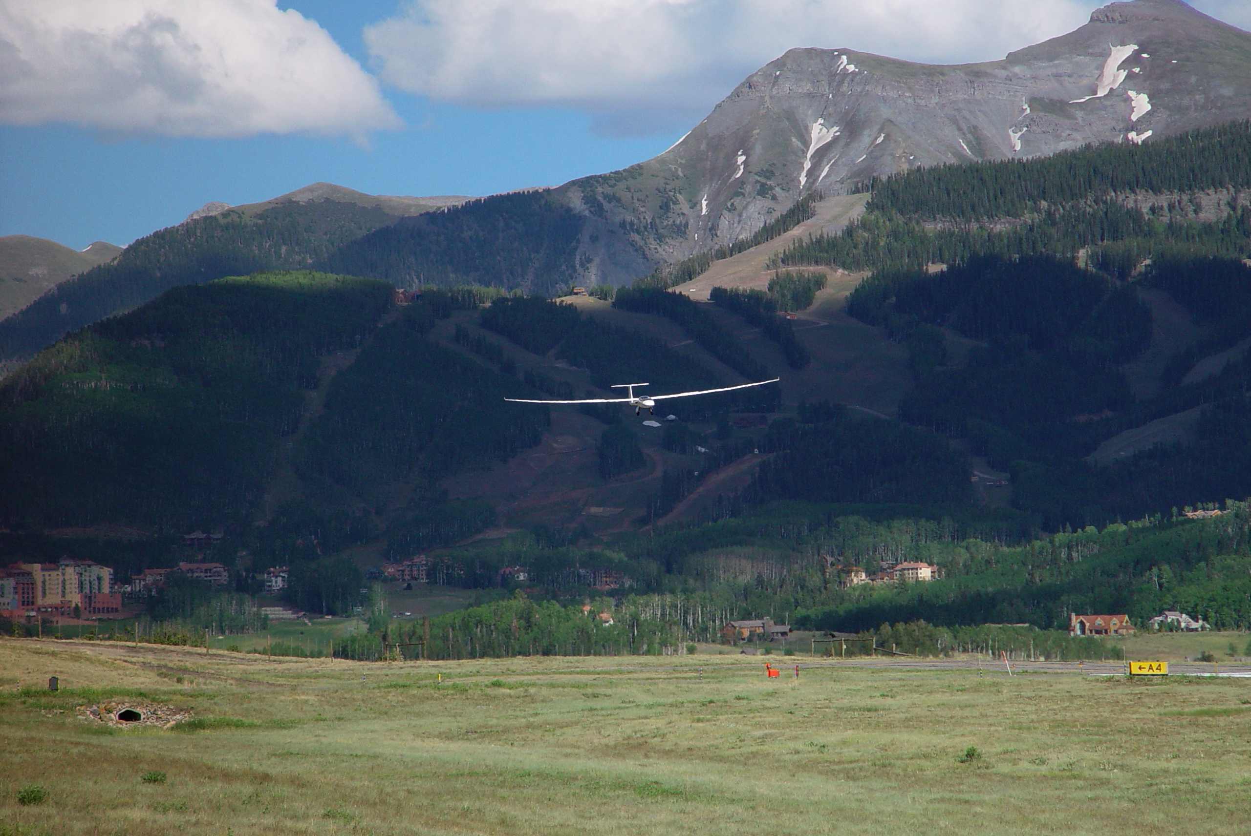 This photo, taken from the ground on a hike, shows two other challenging aspects of the Telluride airport. First, the runway slopes from either end toward the center. Taking off, a plane is likely to lift off on the downhill run and then "land" again when it runs into the uphill part of the runway. More critically, the airport is built on a mesa so even relatively light winds from the wrong direction can create turbulence that would make takeoff and landing dangerous. On the day the safari arrived at Telluride, the winds were 12 kts out of the southeast (the wrong direction!). Since normally even a direct 12 kt crosswind would be no problem for a Stemme, we might have stumbled into trouble, but fortunately our local host "Glider Bob" Saunders warned us of the problem and we diverted to Montrose airport. This necessitated his driving two hours round trip to pick us up, but was worth the added safety. The next photo shows another Stemme on the safari, piloted by Bud Schurmeier, landing the next day and gives some idea of the challenge even when the winds do not create a hazard. Both photos are courtesy of John Morgan.