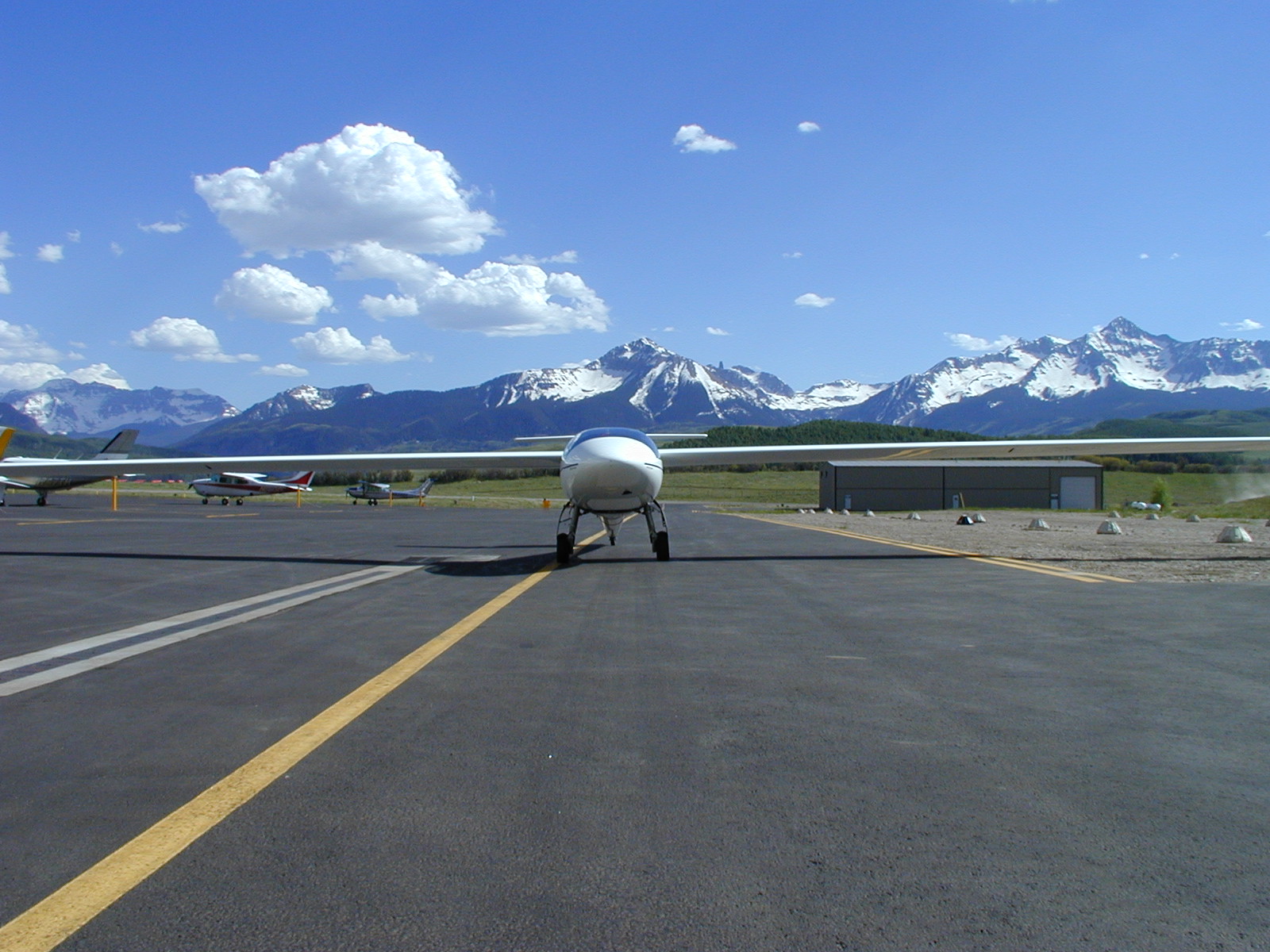 Thin air, turbulence, and gusty winds can make all mountain airports challenging for takeoff and landing, but Telluride, Colorado is uniquely demanding. At 9,080 feet above sea level, Telluride is the second highest commercial airport in the United States. The air is thus thinner than all but one other mountain airport, creating two problems. When an engine gulps thinner air it puts out less power and the plane accelerates more slowly to takeoff speed. Compounding this problem, thin air provides less lifting force on the wing so you need a significantly higher takeoff speed than at sea level. Between these two problems, you can run out of runway before you reach takeoff speed, with obvious, dire consequences. For this reason, pilots must consult tables determining the required runway length before undertaking a flight. Fortunately, my Stemme's engine is turbocharged, so it compresses the thin air and overcomes the first problem. It still requires a higher takeoff speed at Telluride, but the runway is more than adequately long thanks to the turbo.